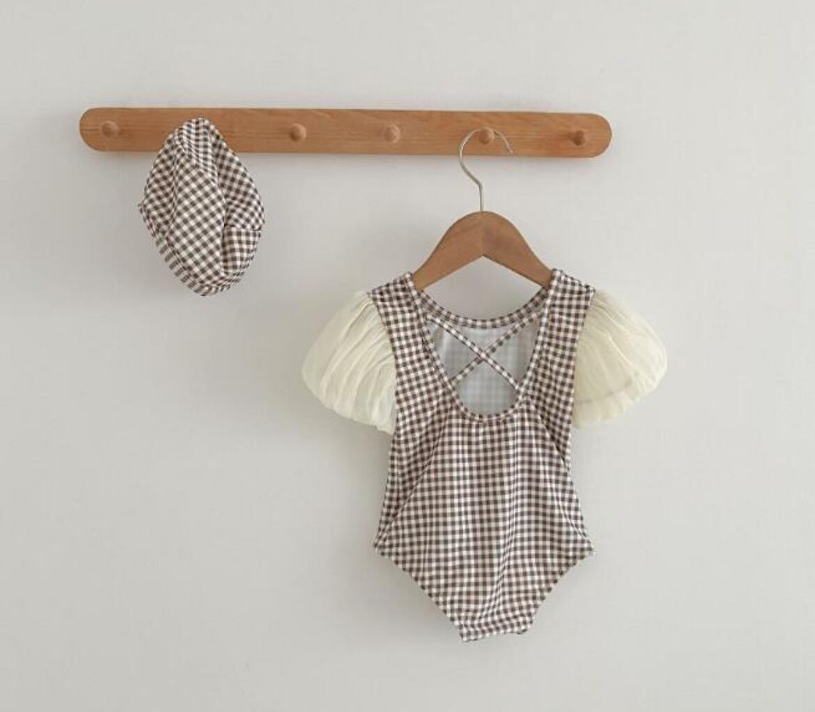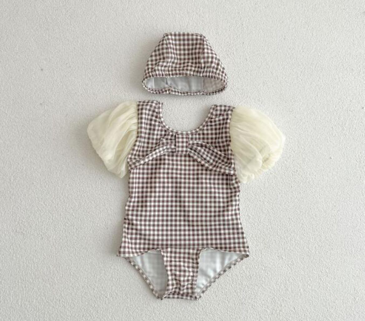 こちらのスイムウェアは、シフォンの袖付きでふんわりとした印象を演出。