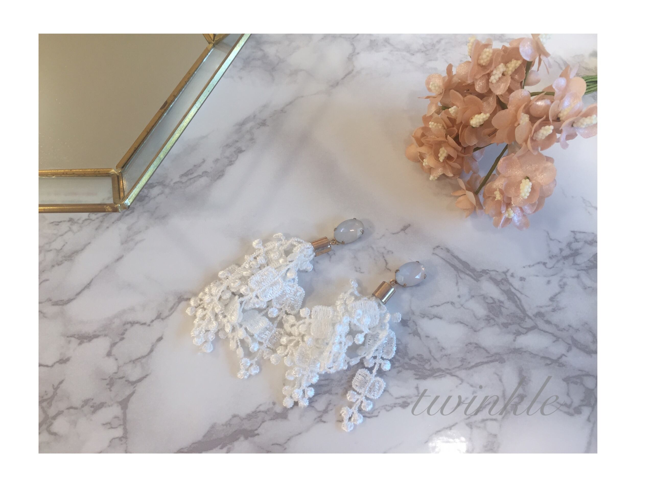グレージュのストーンと爽やかな白フリンジのイヤーアクセサリーです♪