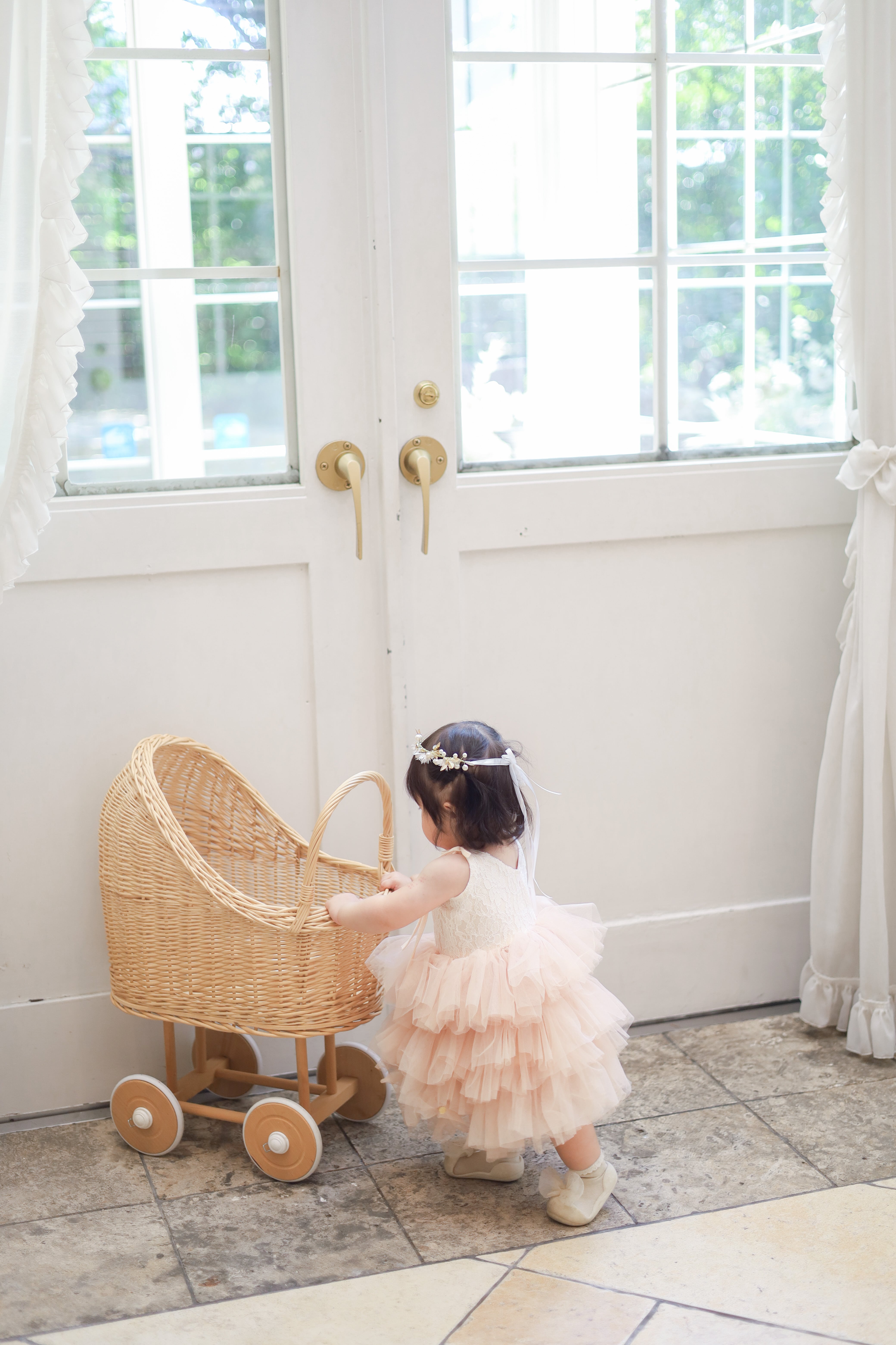 ふんわりしたティアードとくすみカラーがポイントのドレス