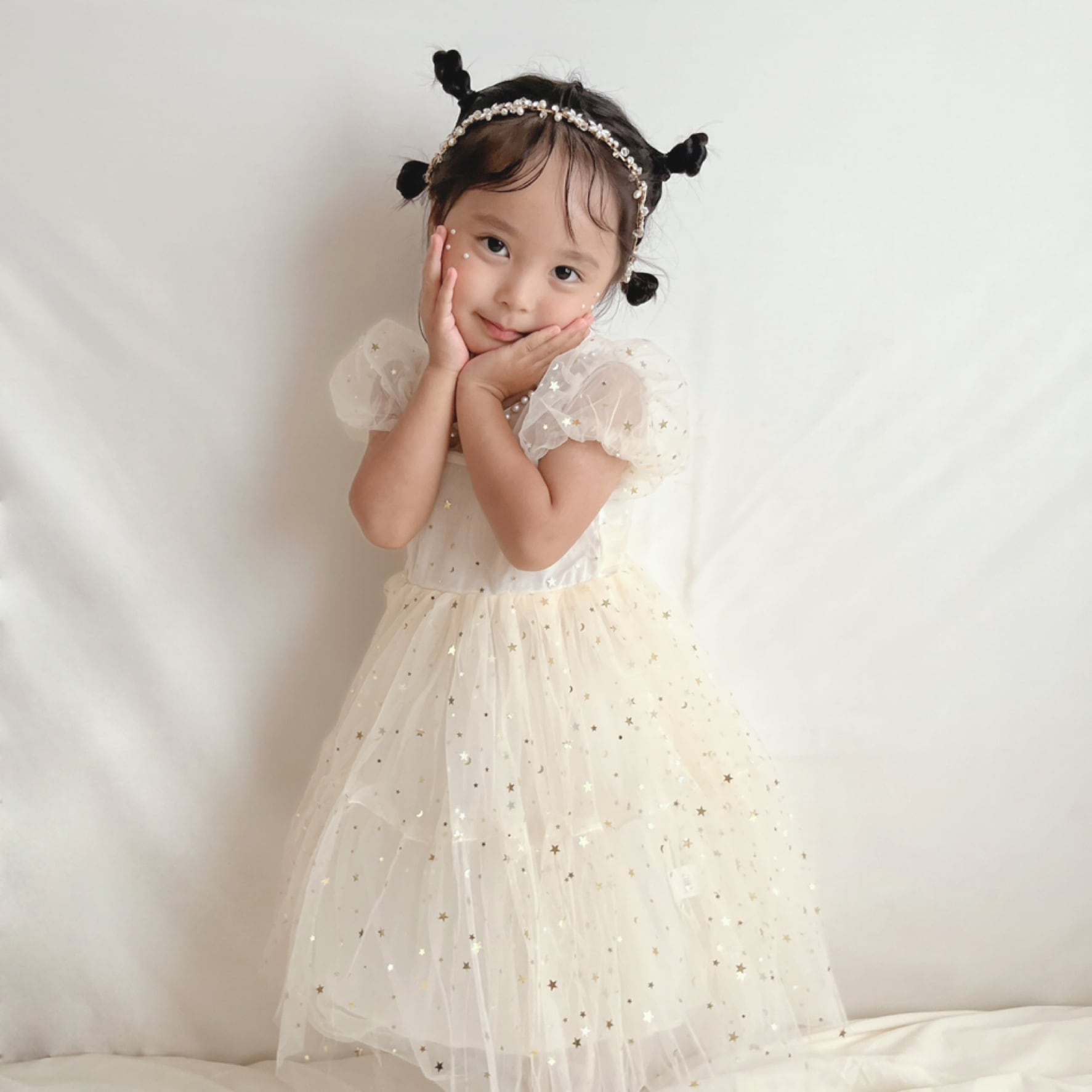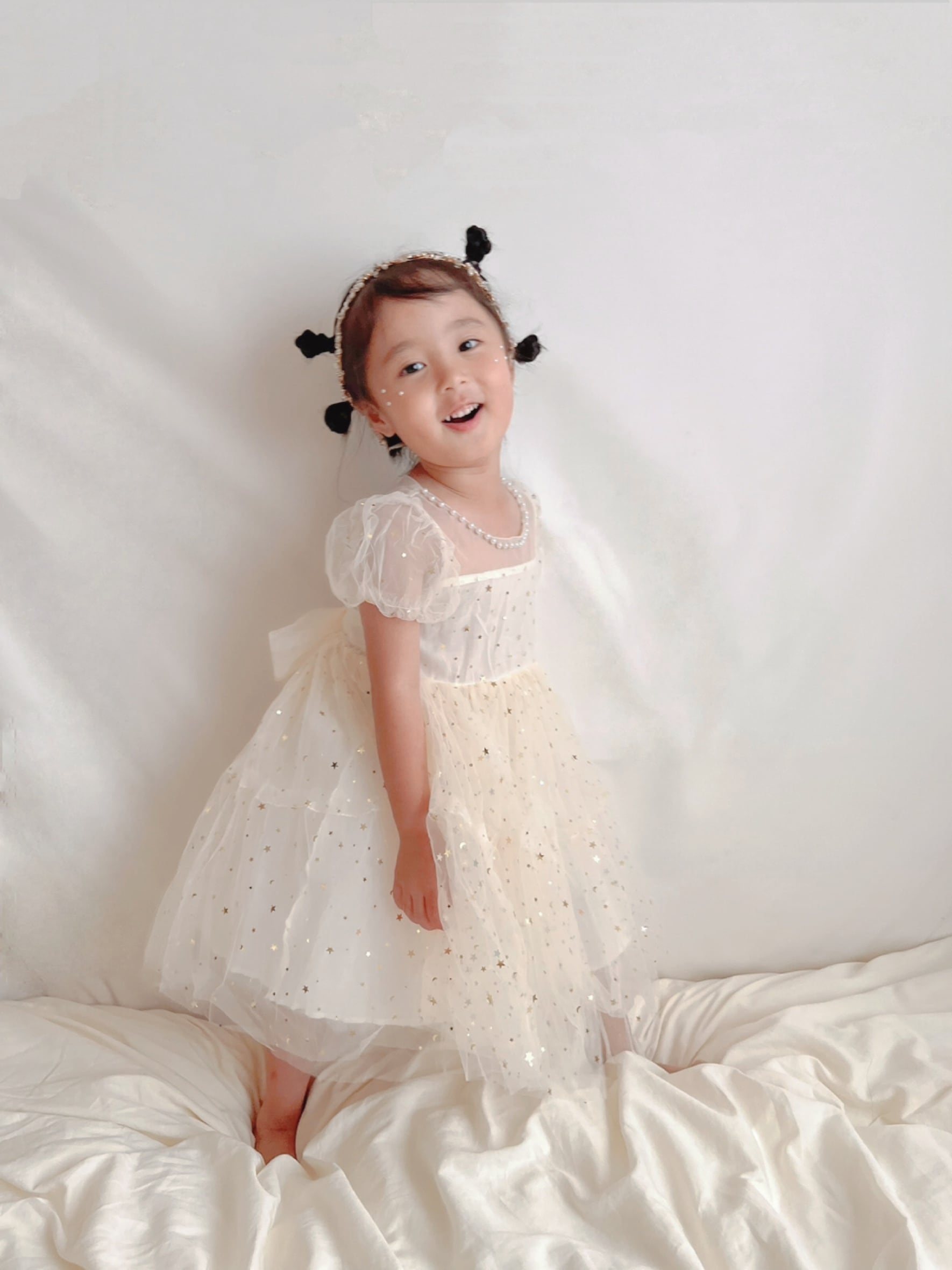 胸元のパールがポイントのtulle dressは、星柄のチュールで作られたロマンティックなドレス♡