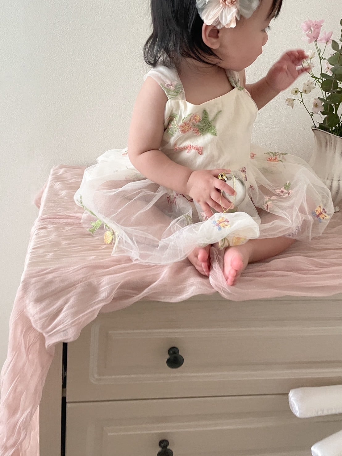 華やかなフラワー刺繡が目を引くロンパースは