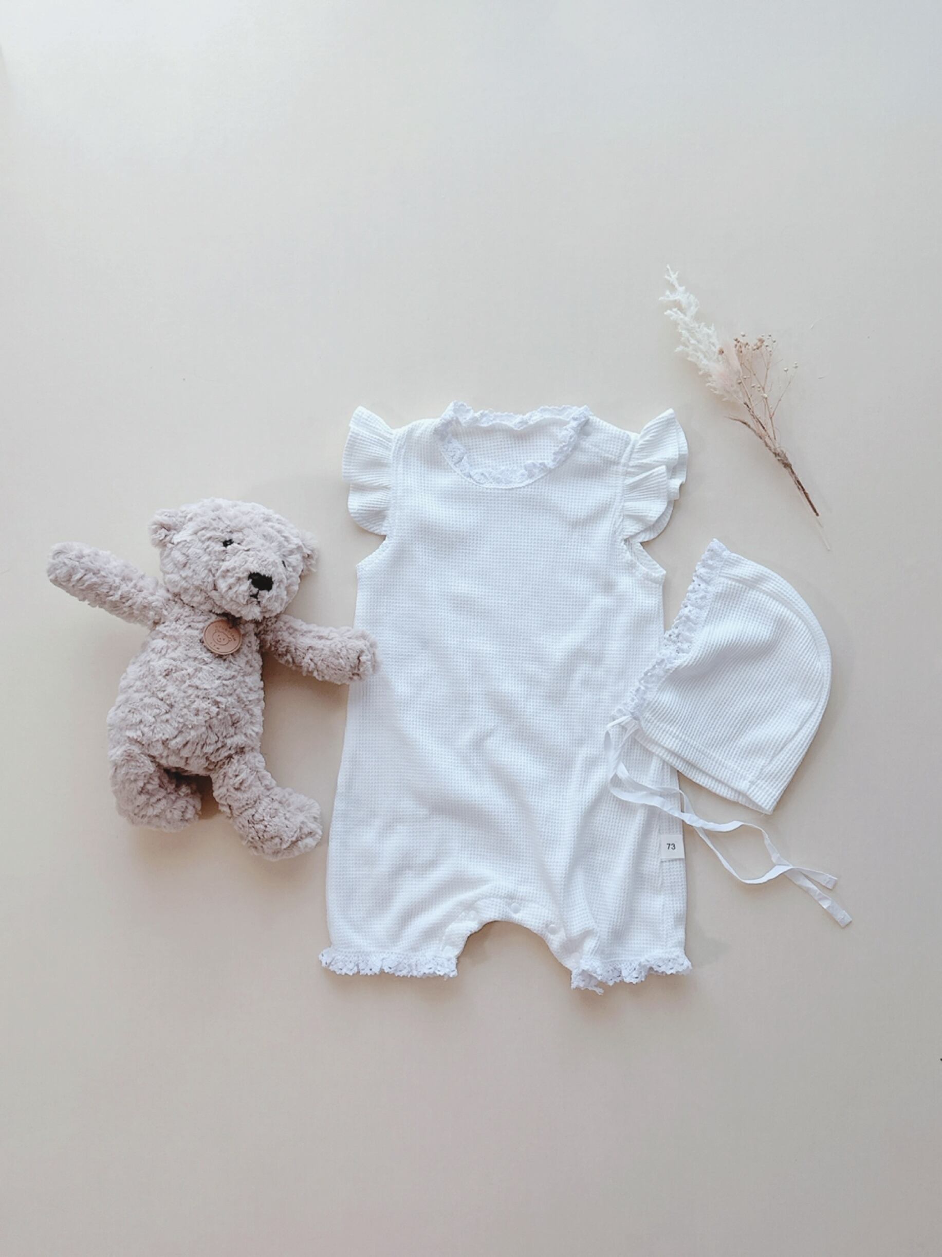 ⚪︎ waffle lace rompers color beige(bonnet付き)